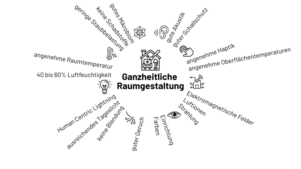 Ein gutes Raumklima ist die Basis für Wohlbefinden, Konzentration und Gesundheit. Aber ein gutes Raumklima besteht aus sehr viel mehr als nur angenehmer Temperatur und Luftfeuchtigkeit. Ob wir uns in einem Raum wohlfühlen, wird neben der visuellen Ästhetik auch durch die Oberflächen, der Luftqualität, den Gerüchen, den Lichtverhältnissen und der Akustik bestimmt.